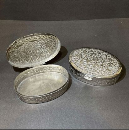 Category: artisan craft/ silver craft Description: This elegant oval silver box features beautiful engravings and a smooth hinged lid, combining everyday use with classic style. It's perfect for storing jewelry, keepsakes, or simply adding a graceful touch to your decor. With its vintage charm and detailed design, it makes a lovely gift or a special addition to any collection. Specifications: - material: 100% pure silver - Color: silver - Weight: 0.93 kg - Dimension: 10x6x3 cm - Care instructions: To preserve its brilliance, clean with a soft cloth and mild soap. Avoid abrasive materials to maintain its exquisite finish. - Uses: Great for storing jewelry or keepsakes, decorating your space, gifting, or adding to a vintage collection. - Origin: Pakistan